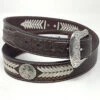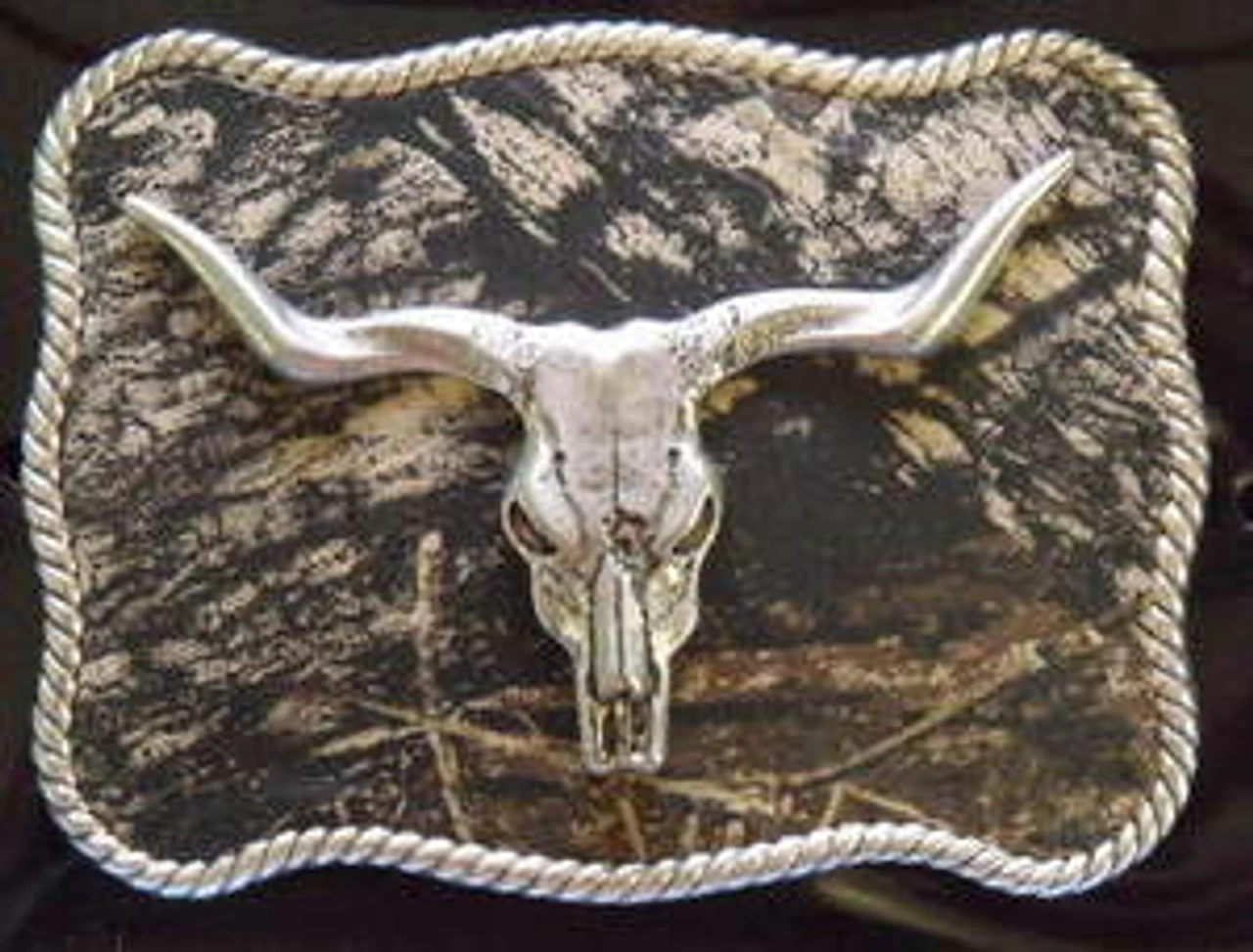 Mossy Oak buckle by Nocona features a Longhorn skull on a camouflage background. It comes boxed, measures 2 3/4″ X 3 3/4″ and will fit belts up to1 1/2″ wide.