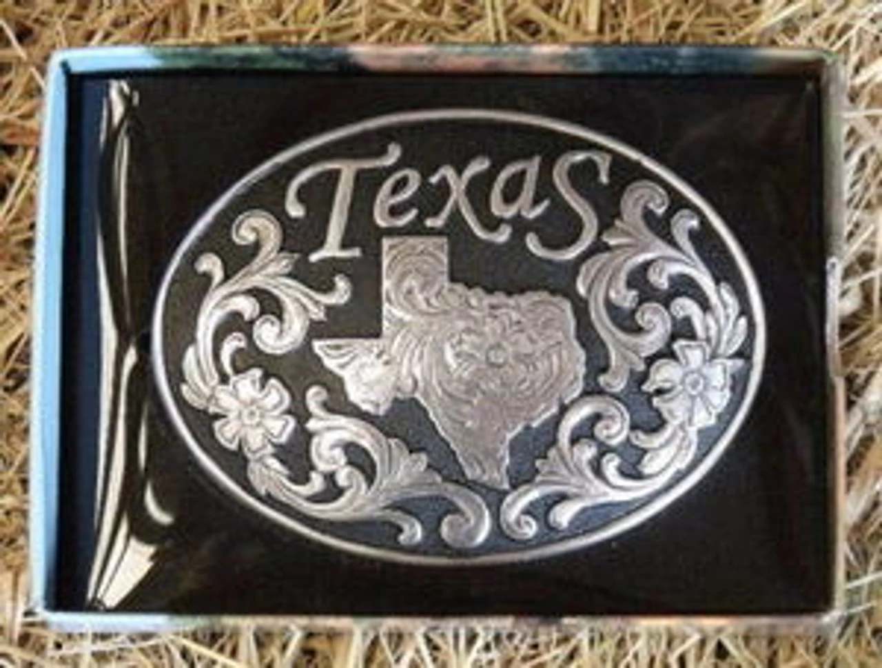 Awesome looking buckle by Nocona in silver tones features the state of Texas on a black matte background. It comes boxed, measures 3″ X 4″ and will fit belts up to1 3/4″ wide.