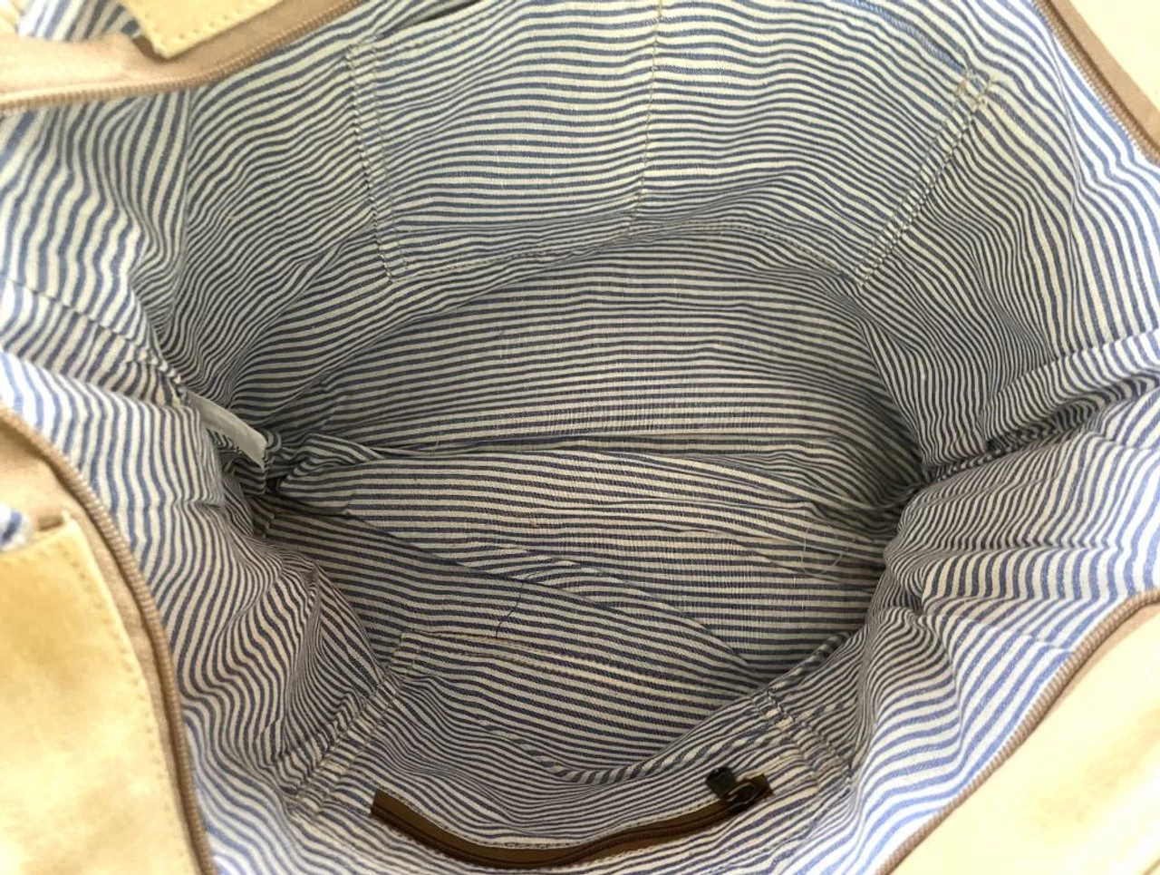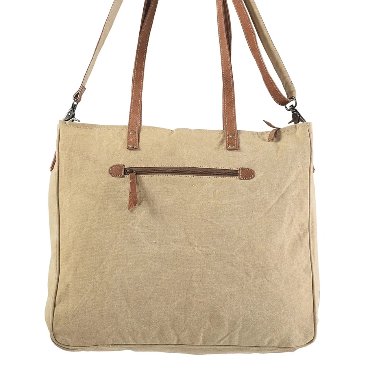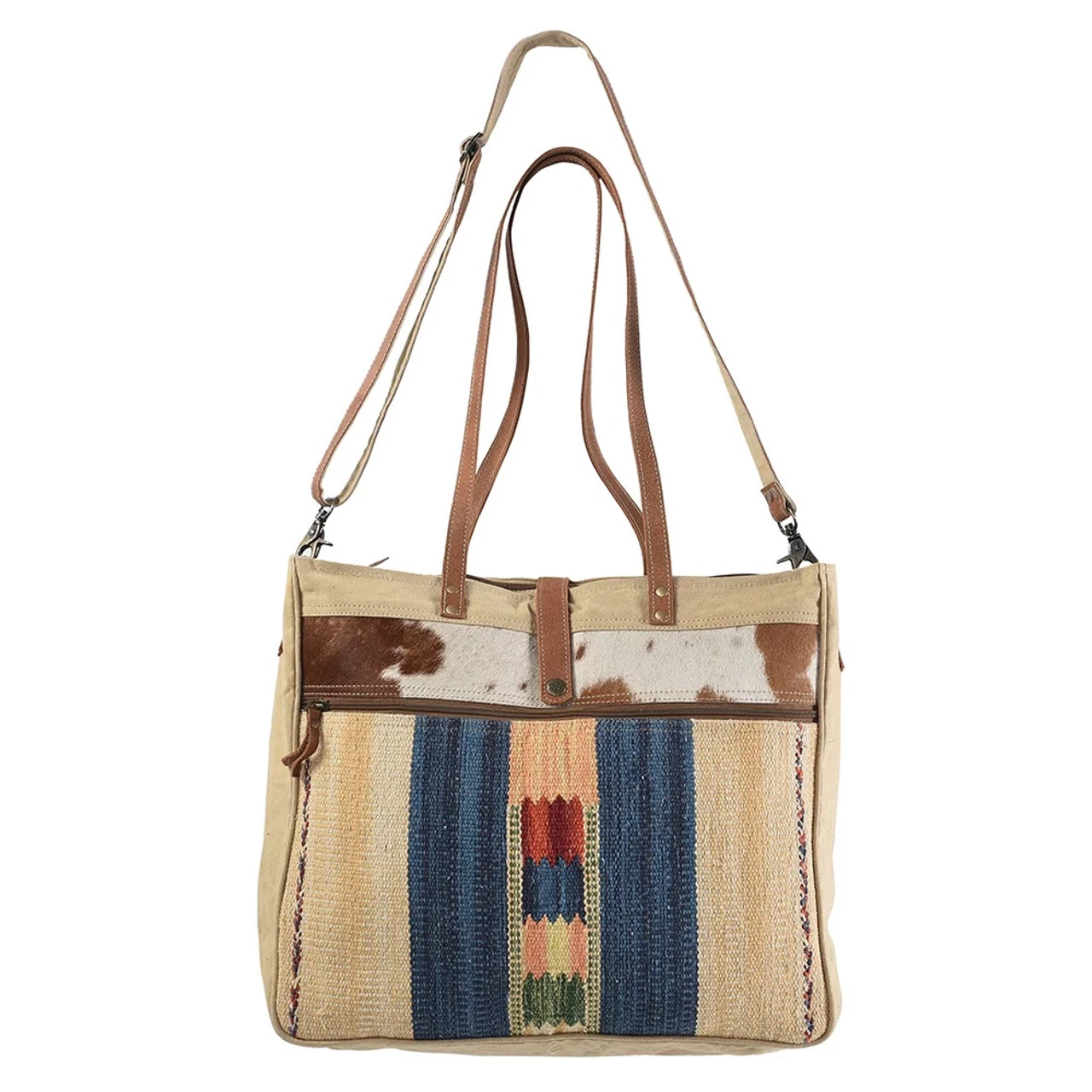 This large ladies bag from Olay (American Darling) is constructed of upcycled canvas. The front of the bag features a western saddle blanket design and hair-on cowhide trim. The front of the bag has a large zipped pocket and the back has a zippered conceal carry pocket. Inside is a cotton liner with two small open pockets and one small zippered pocket. The bag has a zippered and a snap closure and doubles as a shoulder bag which can be converted to a cross body with the included strap.