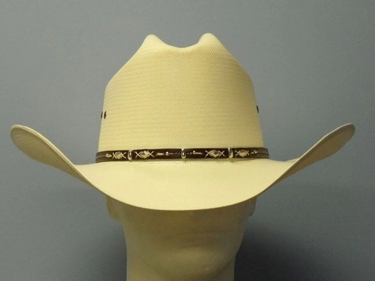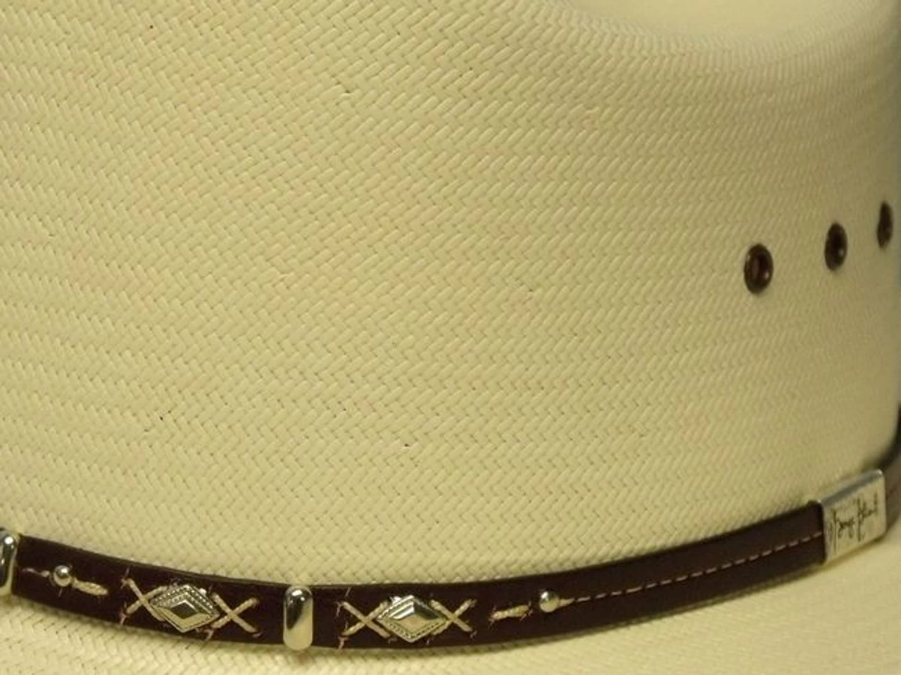 The Hazer is a genuine 10X Shantung Panama straw hat from Resistol’s George Strait collection. It has a 4 1/4″ brim and a 4 1/8″ regular oval cattlemen crown. The brown leather band has cross stitching, conchos and a George strait signature bar. Other features include eyelets, VinylCote for easy cleaning and a cushioned moisture wicking Dri-Lex sweatband.