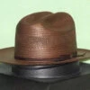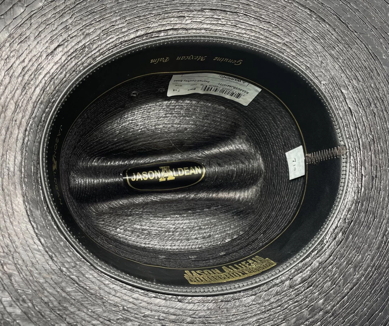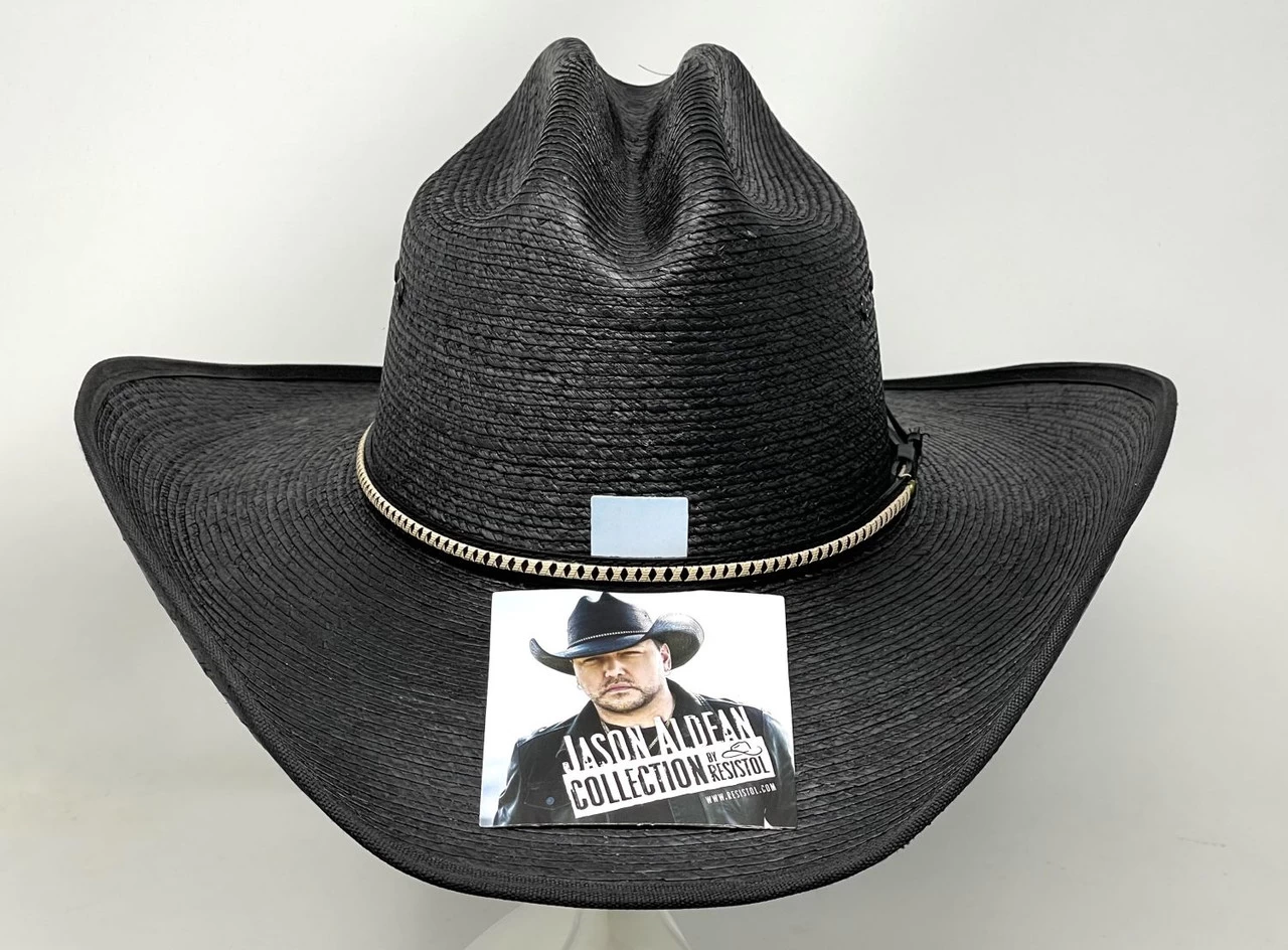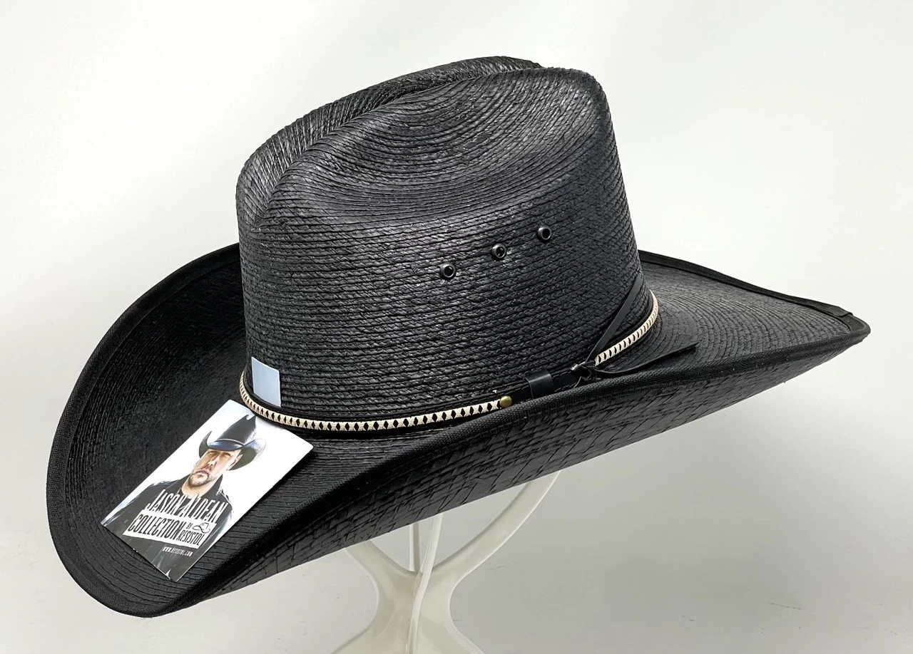 The Asphalt Cowboy is from Resistol’s Jason Aldean Collection. Made of black dyed Mexican palm it has a 4 1/8″ brim and a 3 1/2″ x 4 1/2″ (approximate at front and back crease) sloped, regular oval crown. Features include eyelets for ventilation, a leather band with an overlay of stitched X’s, and a bonded leather sweatband.