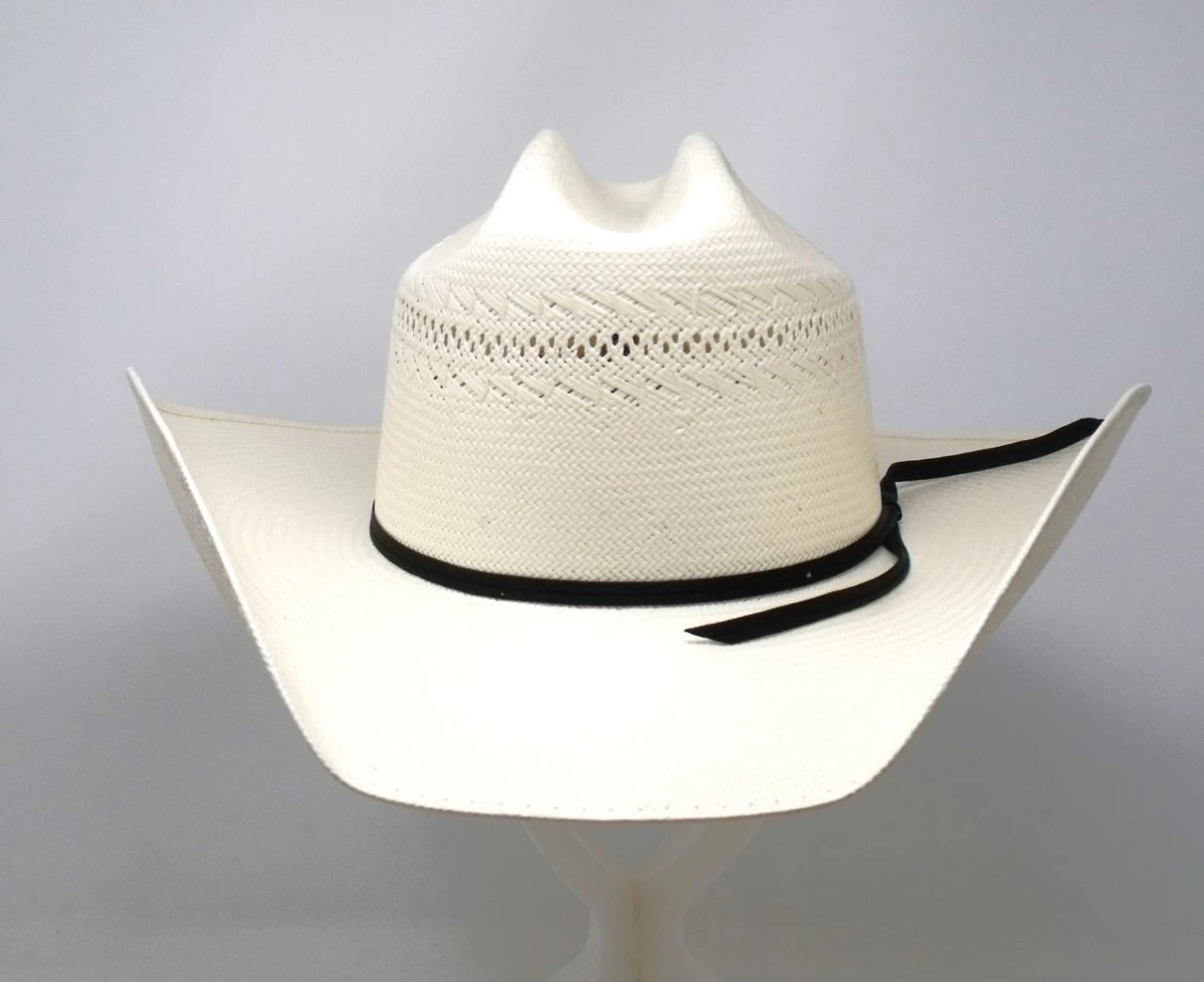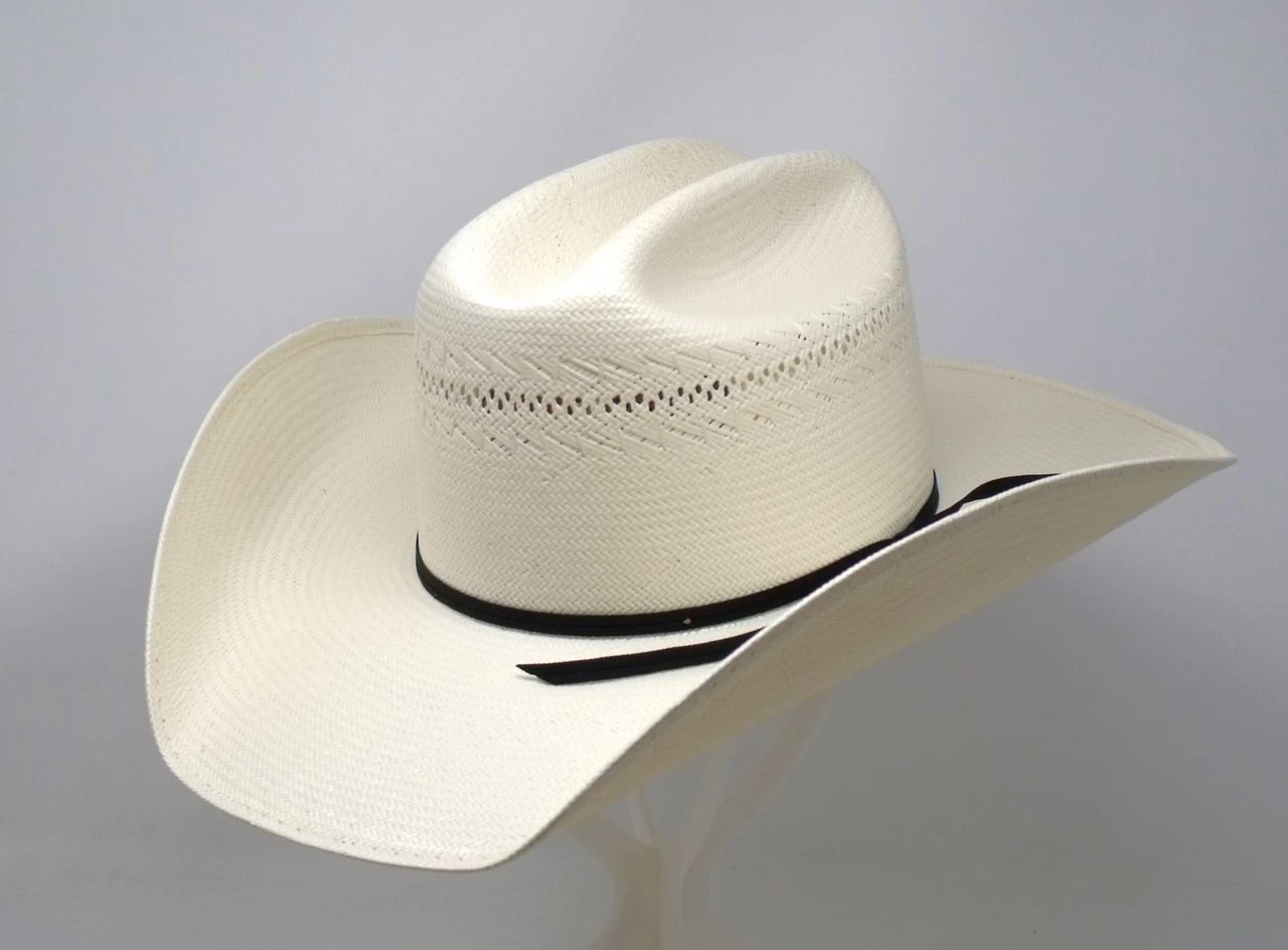 The 20X Luke is from the Double R Collection by Resistol. Constructed of Shantung straw it has a 4 3/8″ long oval, cattleman crown and a 4 1/4″ brim. Features include all around venting, doubled black ribbon band and a leather sweatband.