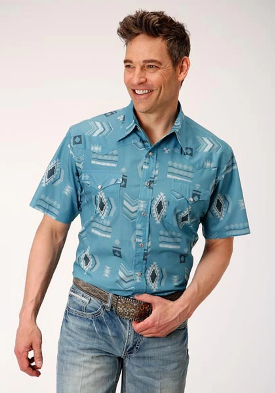This men’s western shirt from Roper’s West Made collection features a mash up Aztec print on 100% cotton poplin. This shirt has one point curved front and back yokes, pockets and flaps, and a pearl snap front closure.Â