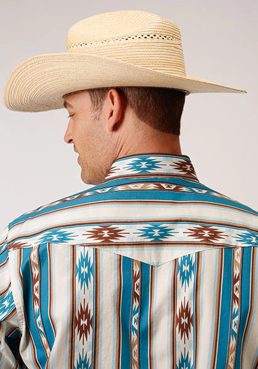 This eye catching shirt from roper features a vertical Aztec turquoise and tan stripes.