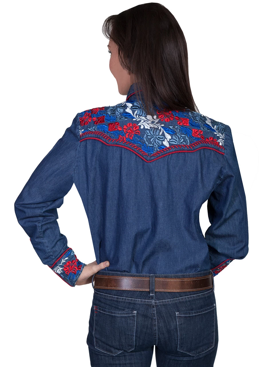 Cowgirl Up in this great looking shirt from Scully’s Western Legends Collection. It features foral tooled embroidery on the front and back yokes and the cuffs, smile pockets and snap closures o the placket and cuffs. Made of 65% polyester and 35% rayon it is available in an array of colors.Â