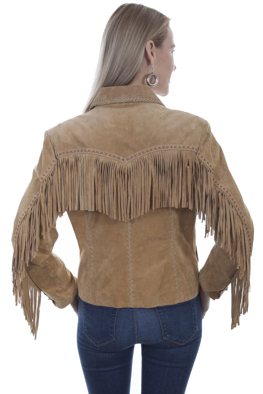 This easy-fit soft suede fringe jacket from Scully Leather features a snap front closure, fringe yokes front and back, and fringe down the sleeves. This western design also features whip stitched lapels that run down the front and end at the hemline. Exquisite braiding on the seams and a contrast stitch that follows the fringe. Avilable in Black and Old Rust and lined in acetate.