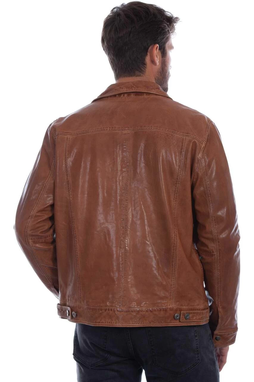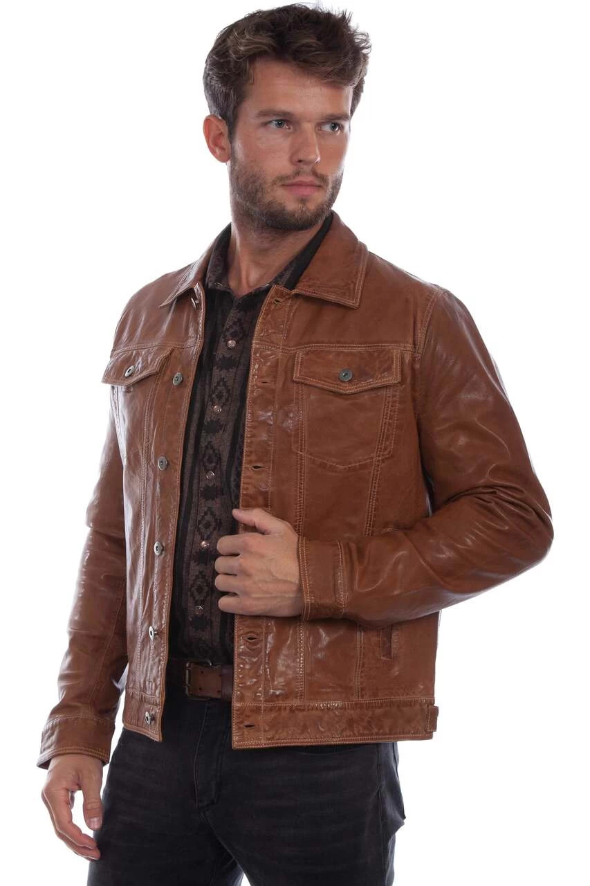 This classic silhouette in a washed lamb jean jacket from Scully Leather features a metallic button front, two flap chest pockets with button closures, two lower vertical side entry pockets, and two adjustable cinch tabs at the waist.