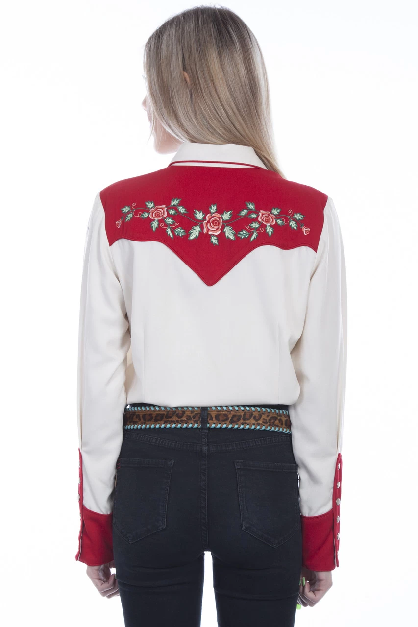 This pretty shirt is a poly/rayon blend from Scully’s Western Legends collection. Features a snap front and cuff closures. It has a rose and vine embroidery with a center red pleat and arrowheads. The back yoke features a rose embroidery.