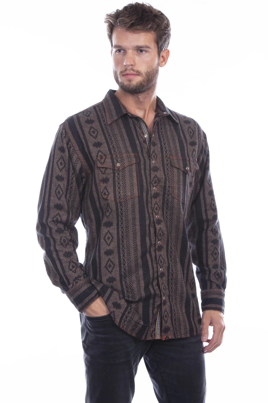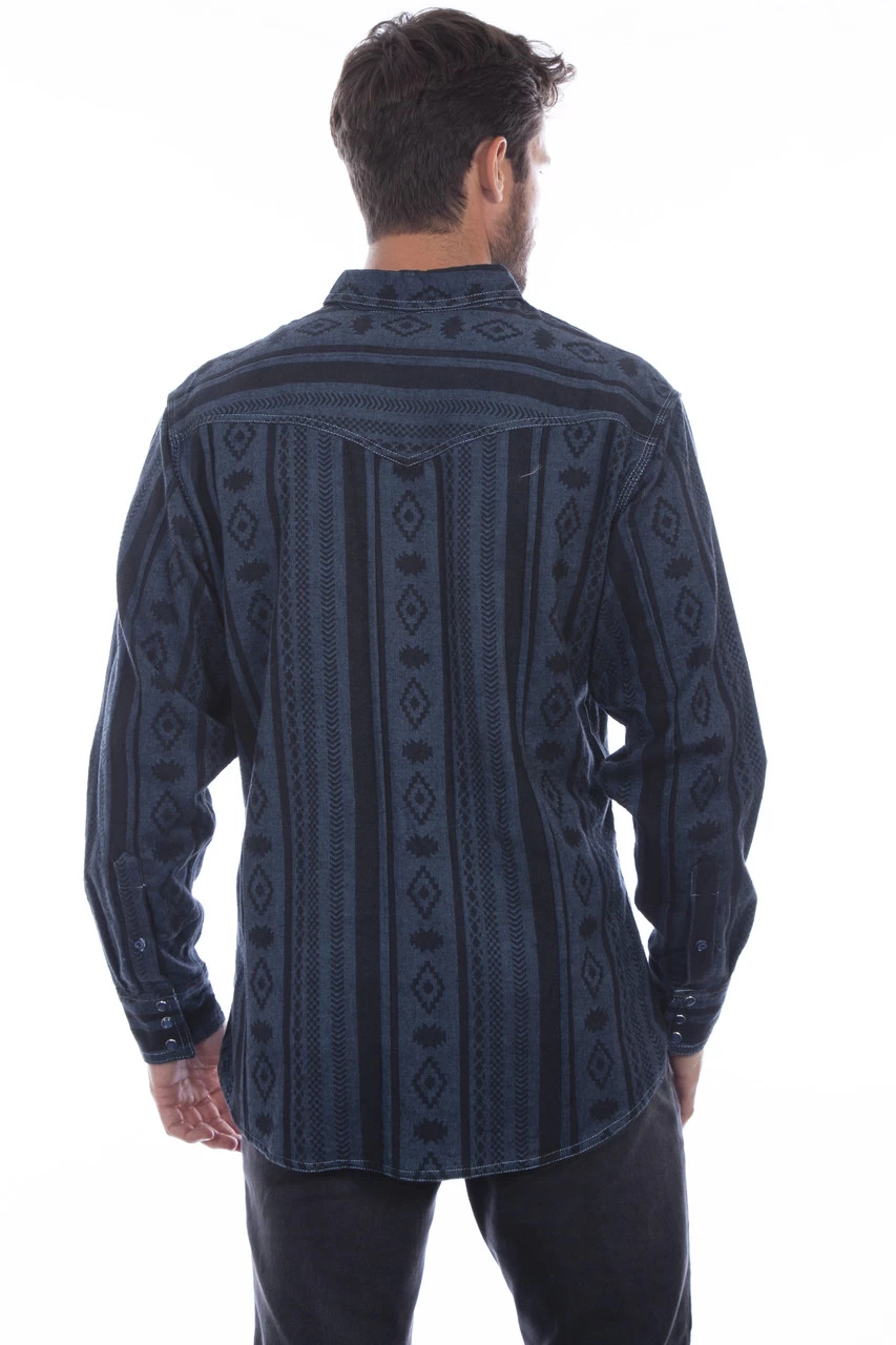 Spice up your everyday routine with this eye catching Aztec inspired design that adds a sense of history. From Scull’s Signature Series it features a snap front closure snap cuffs and two chest flap pockets with snap closure. Contrast fabric on inside placket collar and cuffs.