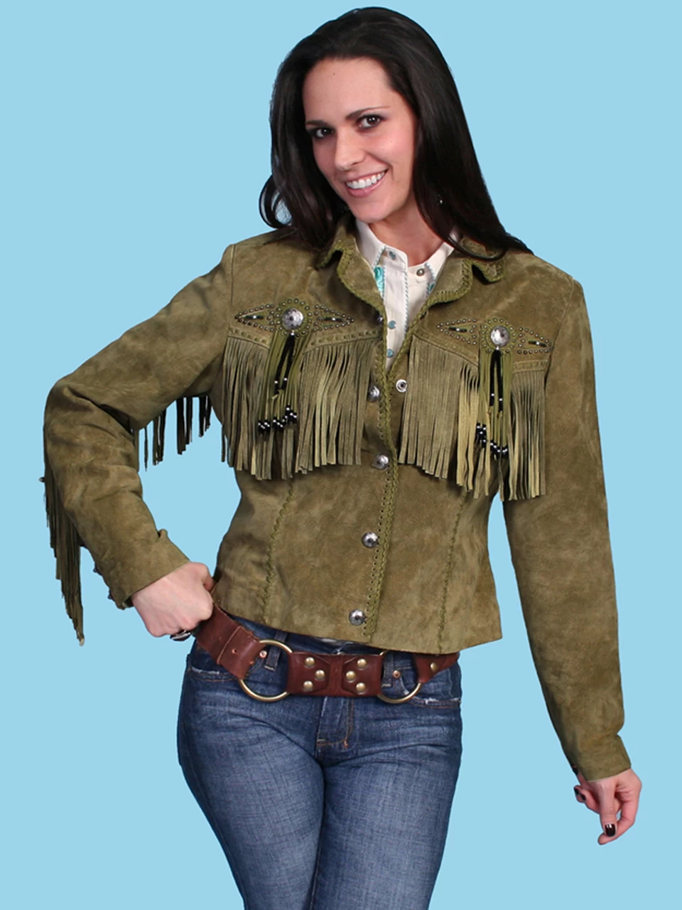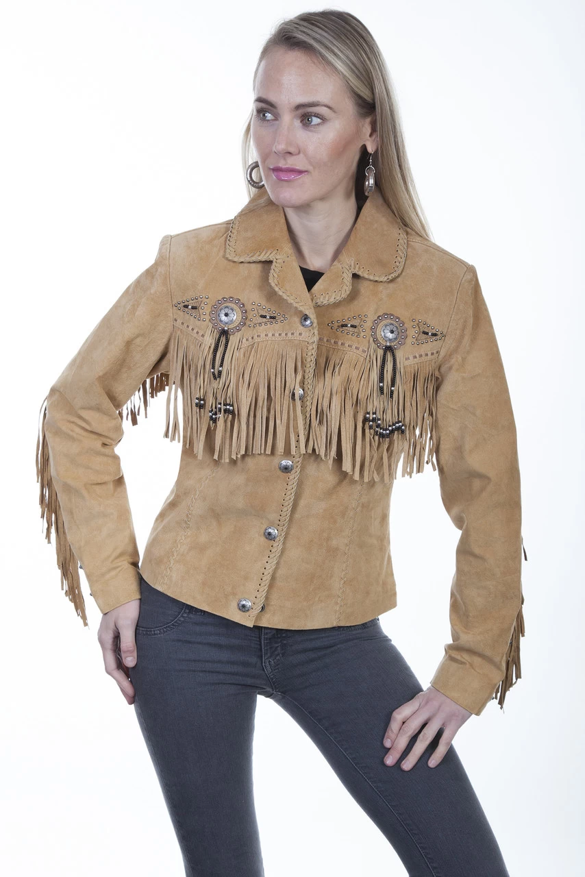 Step out in Western style with this flattering jacket from Scully Leather. Constructed of 100% boar suede leather it features fringe yokes front and back and down the sleeves along with conchos with beaded fringe and stud and bead design detail. Available in eight colors.