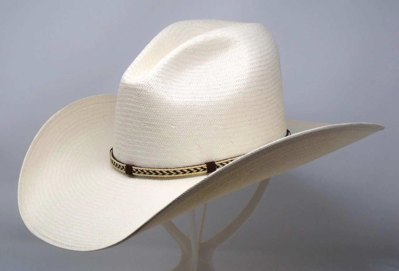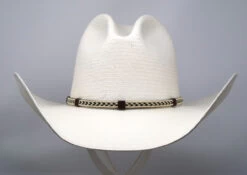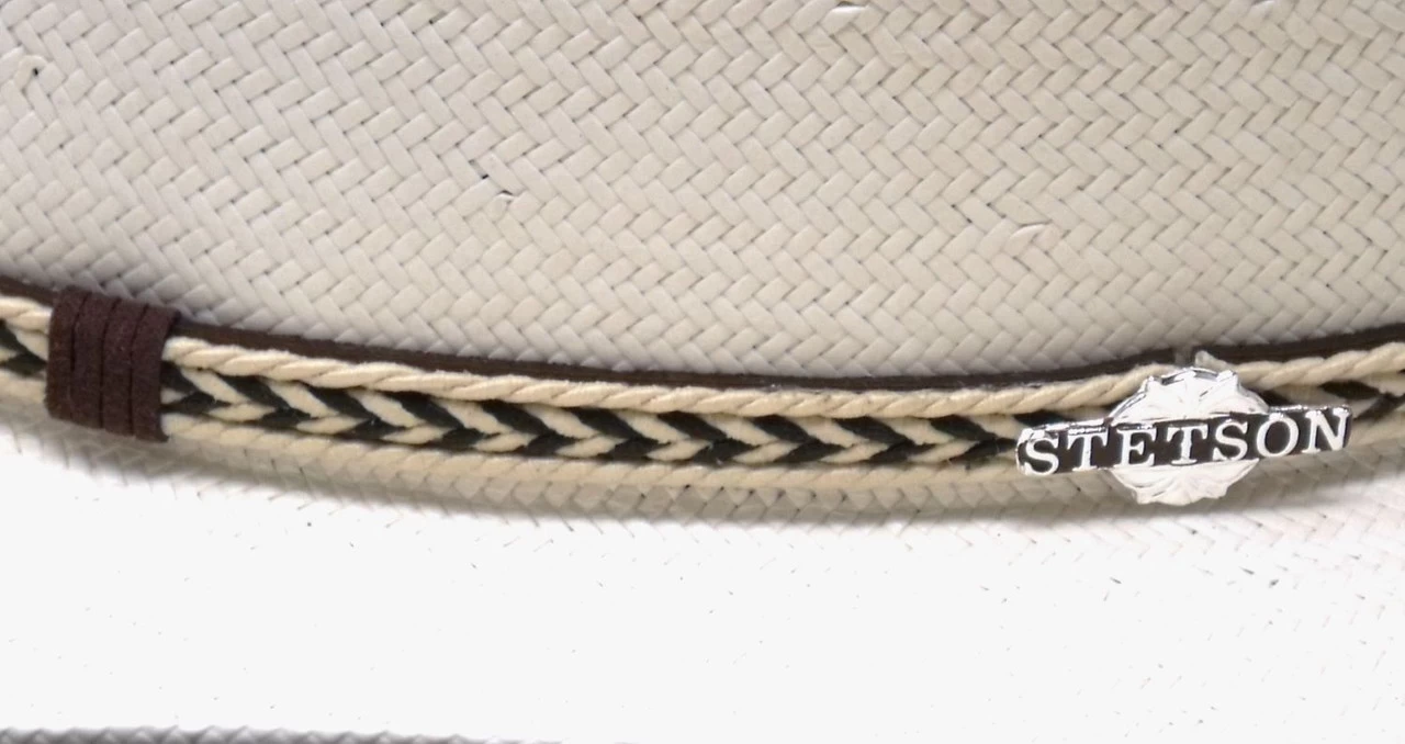 Stetson’s Centennial is made in the USA of 8X quality Shantung straw. It has a shady 4 1/2″ brim and a 4″ x 5 1/2″ (measurements may vary slightly) regular oval, Gus style crown. Features include a fancy braided rope over sueded leather band, a Stetson medallion and a moisture wicking DriLex sweat band.