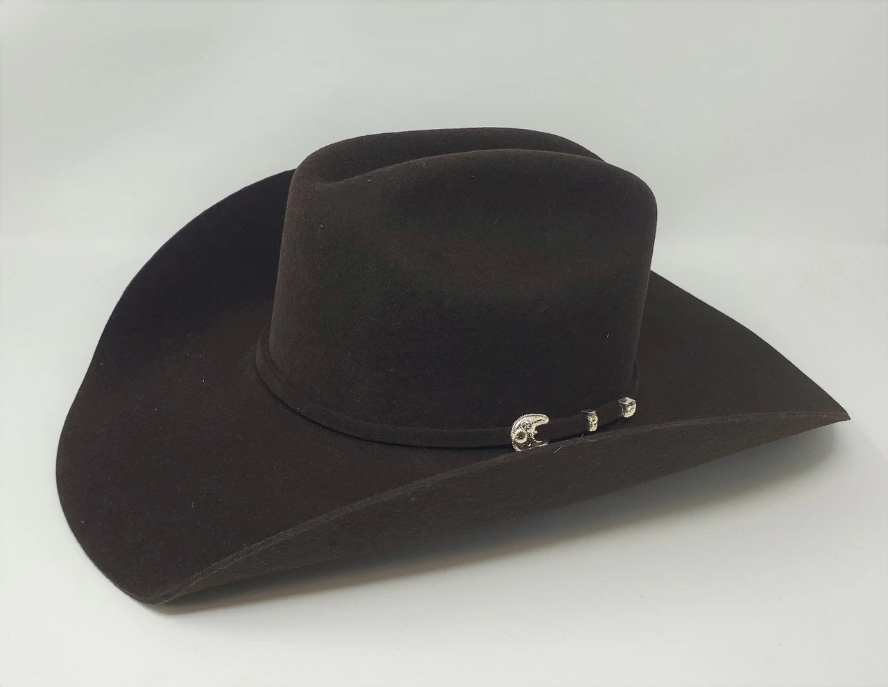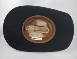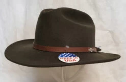The “Corral” by Stetson is made in the USA of durable, water resistant, 4X Buffalo felt. This great looking cattleman creased hat has a 4 1/4″ shovel brim and 4 1/4″ regular oval crown. It features a leather sweatband, satin lining, and a matching band with 3-piece silver toned buckle set.