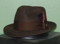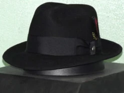 Made in theĀ USA the StetsonĀ FrederickĀ comes at a very reasonable price. Constructed of 100% wool it has a 2″ under weltĀ brim and 4 1/2″ (approx.) center dent crown. Features include a wide 1 3/4″ grosgrain ribbon band with Stetson pin and removable feather, leather sweatband and full satin lining.