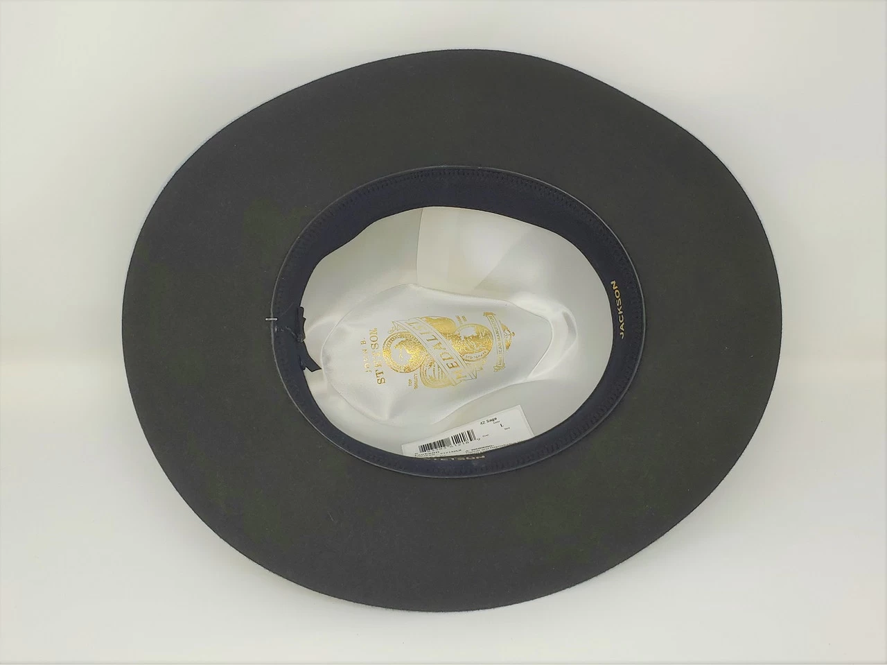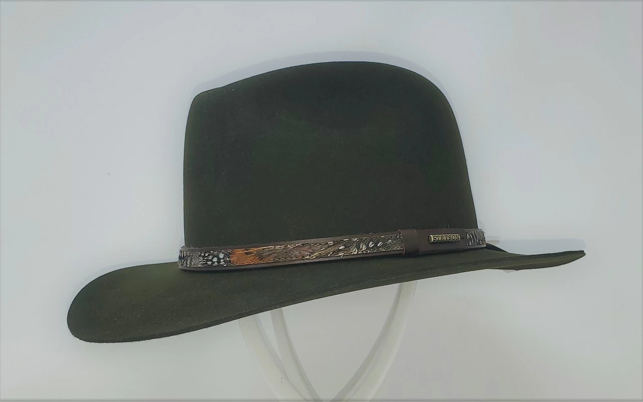 The Jackson is a stylish, crushable fedora from Stetson’s Medalist Collection. Made in the USA of a 5% fur and 95 % Merino wool blend it has a dimensional ( 2 3/4″ X 2 1/2″ ) brim and a 4 1/2″ (approx. at front crease) crown. It features a leather band with feather overlay, moisture wicking Dri-Lex sweatband and full satin lining.