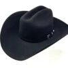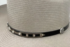 It has a 4 1/4″ brim and a 4 1/8″ cattleman crease crown. Features include a layered black and brown band accented with silver tone metal studs, and a genuine leather sweatband.