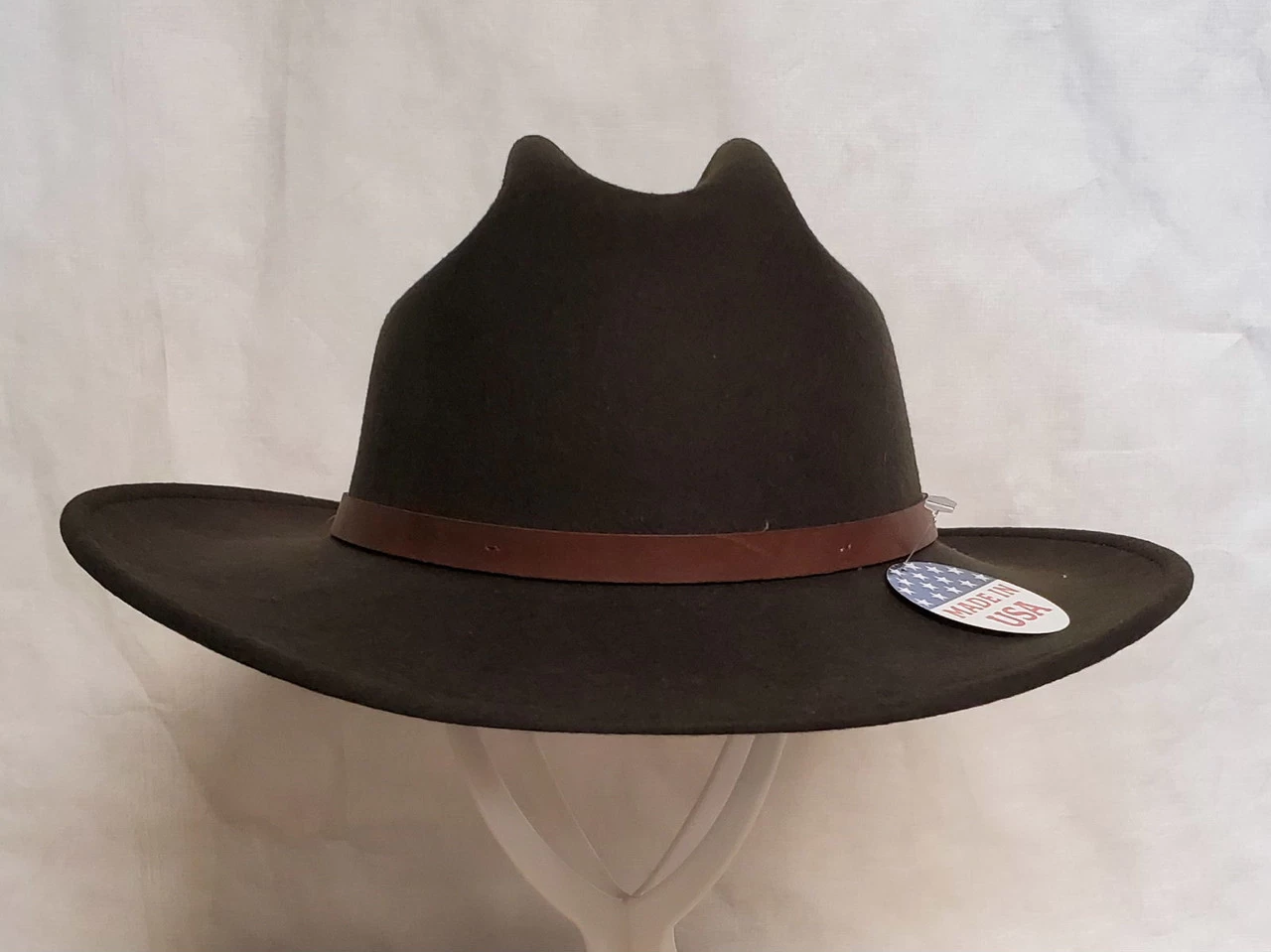 Stetson’s Route 66 is a crushable hat made in the USA. Constructed of 100% wool it has a 4 1/4″ (approx.) cattleman crown and 3″ underwelt brim. Features include a brown leather band with metal Stetson emblem, DriLex sweatband and full satin lining.