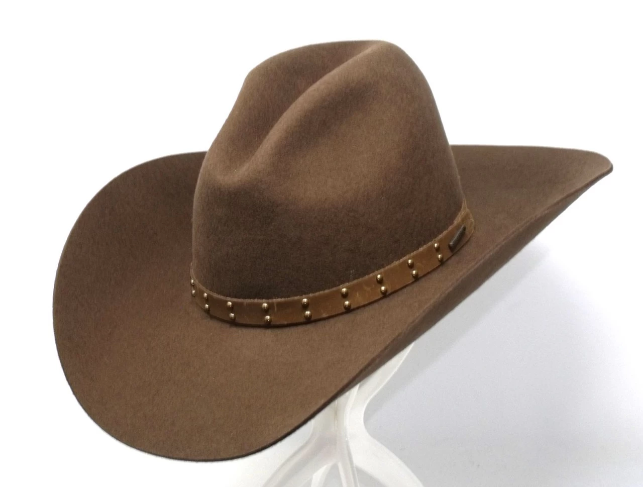 Made in the USA the Seminole is from Stetson’s Buffalo Collection. It is constructed of durable, water-resistant 4X quality Buffalo wool. It has a 4″ brim and a Gus style crown which measures approximately 4″ in front and 5″ in back. Features include a brown leather band embellished with nail heads studs and a Stetson pin, leather sweatband and a full satin lining.