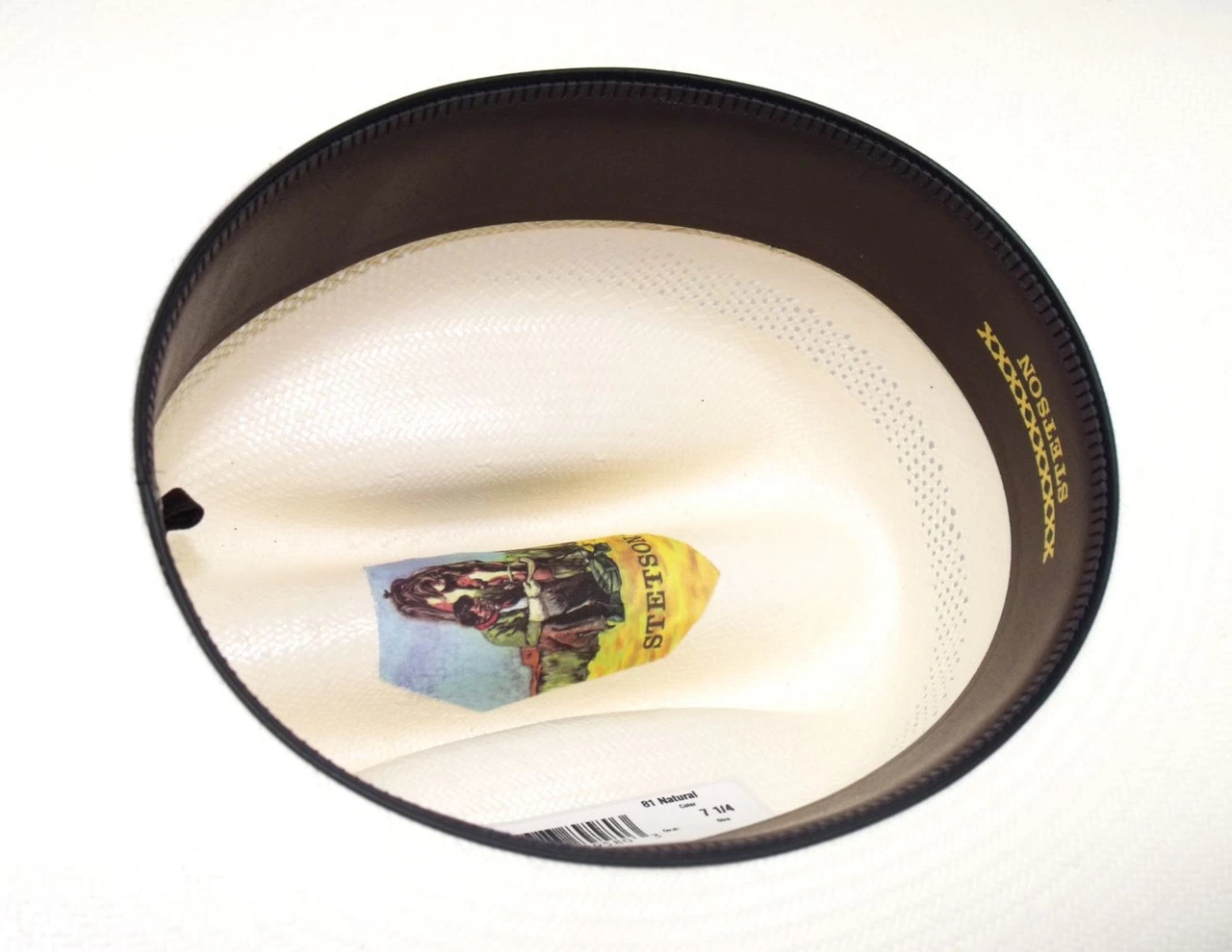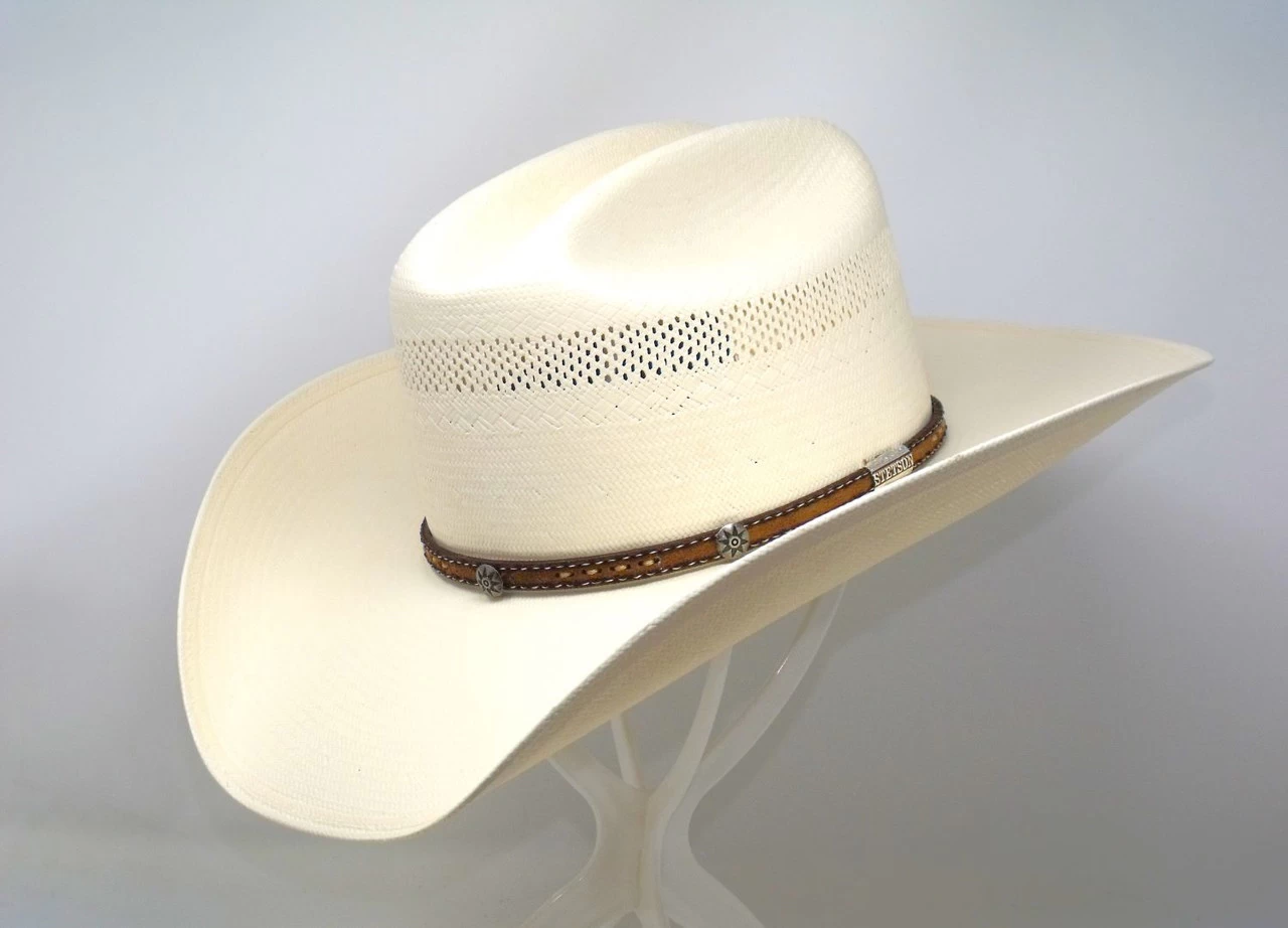 Made in the USA Stetsons Woodburn is constructed of 10X quality Shantung straw. It has a 4 1/8″ cattleman crown with all -around venting, and a 4 1/4″ brim. Features include a brown leather band with silver conchos and center stitch, and a leather sweatband.
