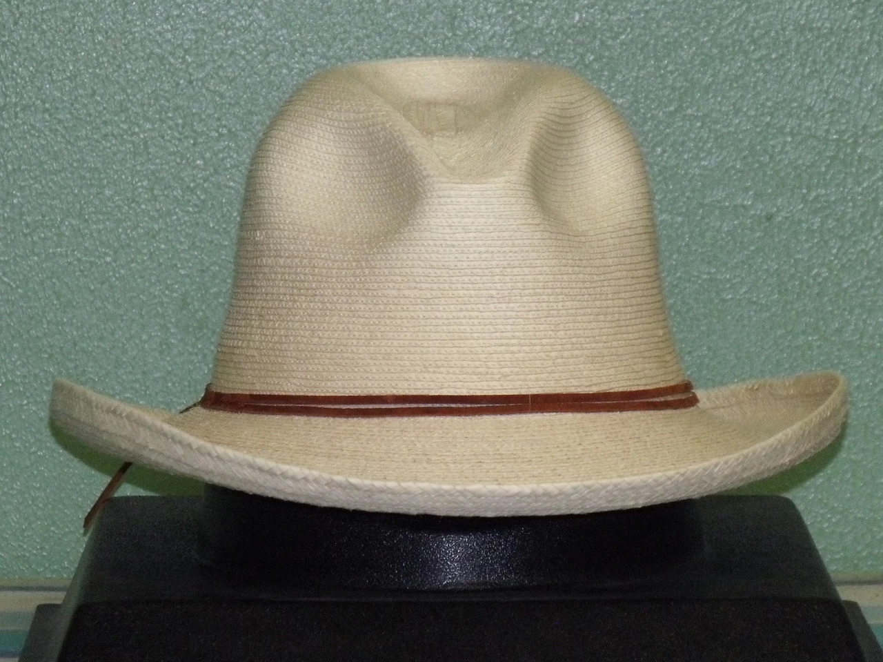 Based on the hat worn and styled by R.B. Hathcock. RB’s hat is made by SunBody of fine (10 – 12 strands/inch) Guatemalan palm . It has a 3″ brim and a sloped fedora creased crown which measures approximately 3 1/2″ in front and 5 1/2″ in back. Features include suede lace band, comfortable fabric sweatband and a UPF 50+ rating.