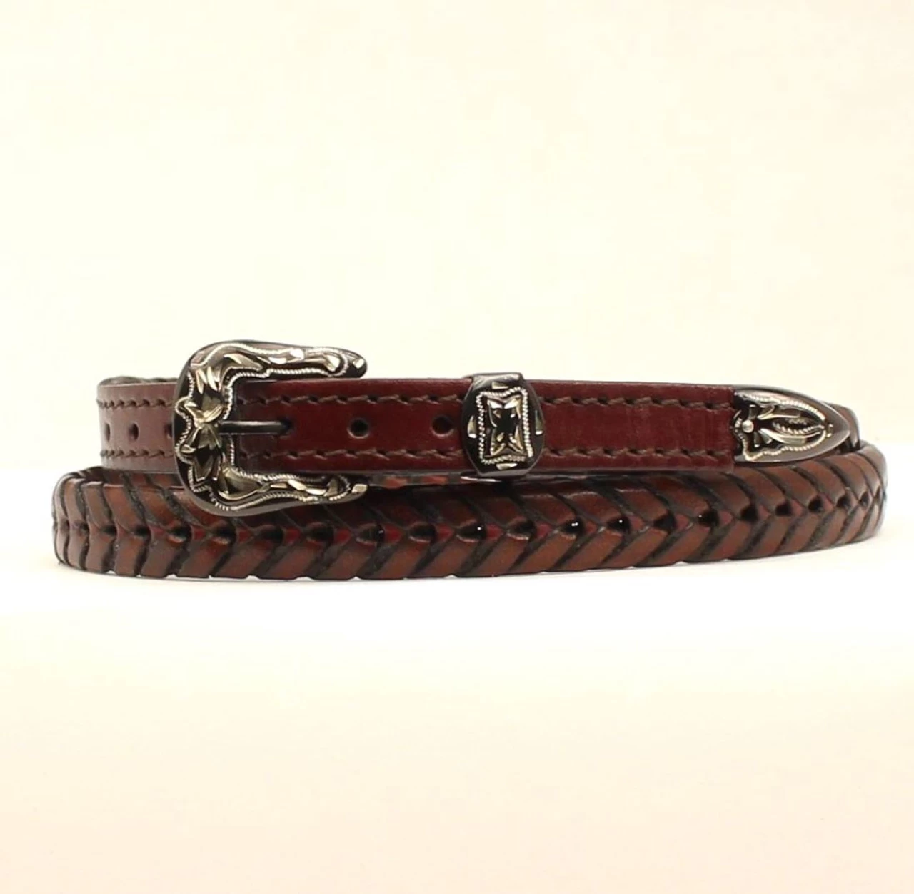 Dress up your hat with this leather band from M&F Western Prorducts Double S collection. Availble in several colors it is 3/8″ wide and is constructed of laced leather with smooth tabs and features a 3 piece buckle set.