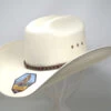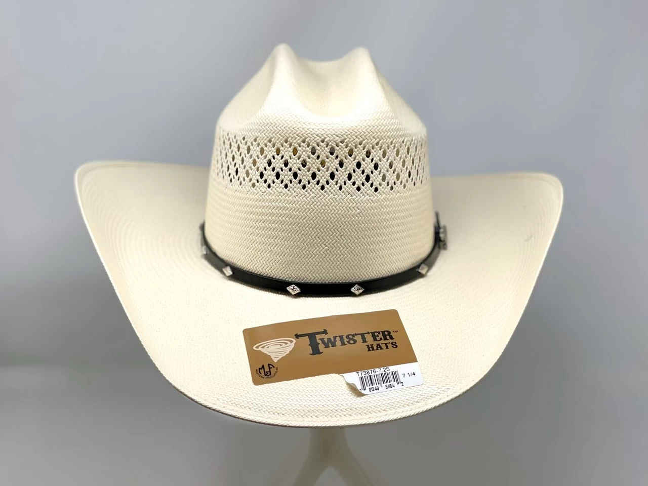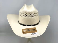 The Twister A73876 is from M&F Western Products. Constructed of 20X Shantung it has a 4 1/4″ crown and a 4 1/4″ brim. Features include airy, all-around venting, a leather band with diamond shaped studs and a Twister pin, and a leather sweatband.