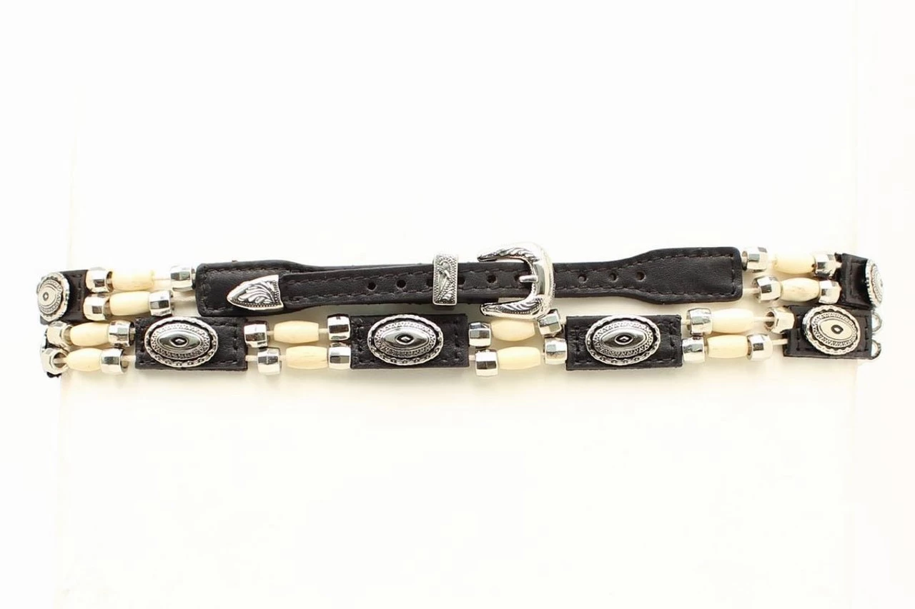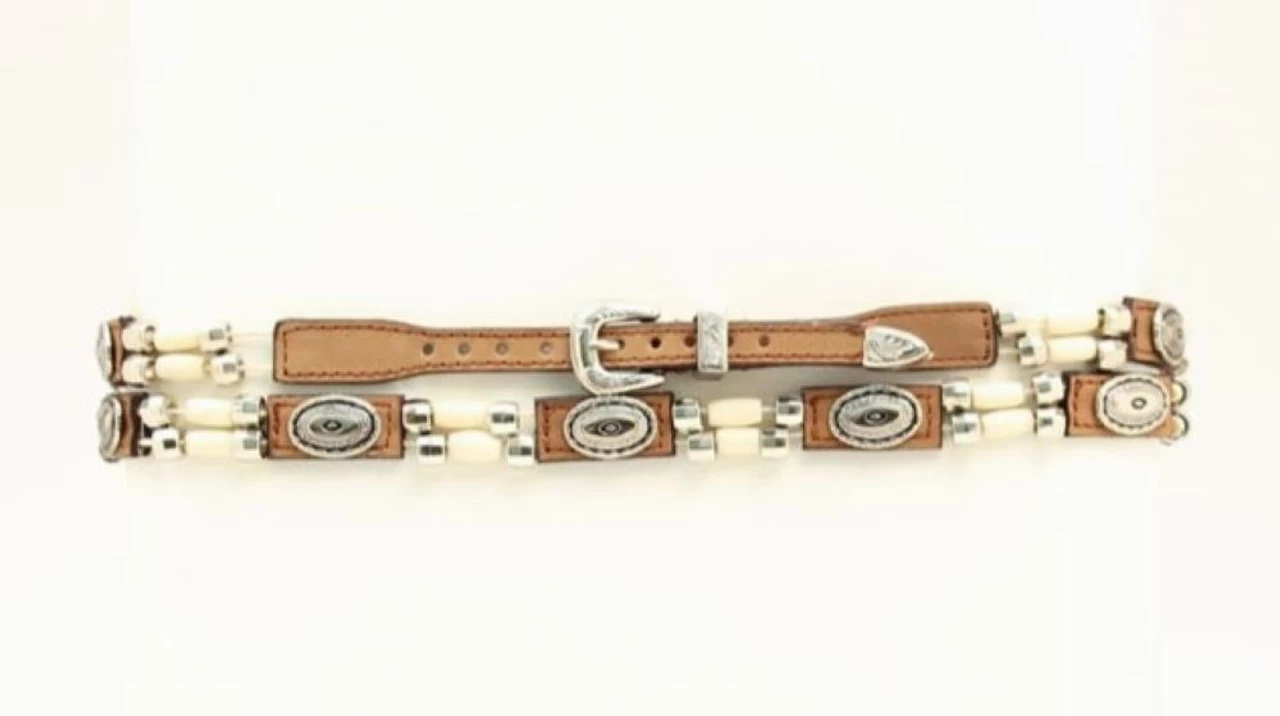 Create your own personalized hat style with this genuine leather hatband from M&F Western Products Double S collection. The silver conchos against the brown/black leather background, and the silver and ivory beads adds a touch of western flare that will definitely give you a distinguished look. The band is 26″ long, 1/2″ wide and tapers to /38″. Features include a 3 piece silver tone buckle set.