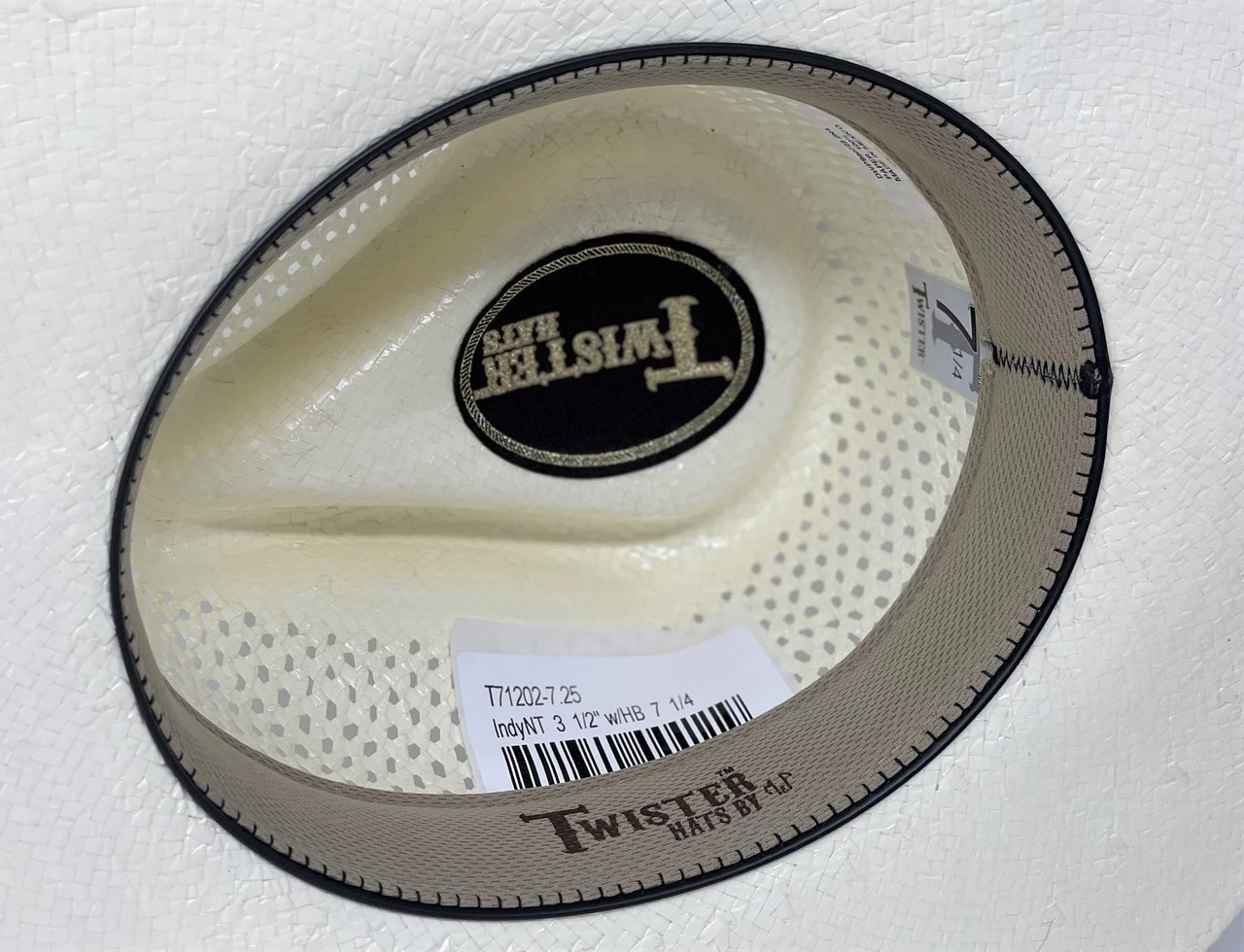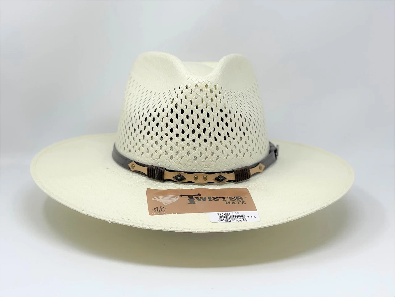 The 71202 is an economy straw hat from M&F Western’s Twister Collection. Made of shantung panama straw it has a 3 1/2″ brim and a 4 1/4″ pinch front crown. A good work/casual hat offering plenty of ventilation and a Dri-Lex sweatband.