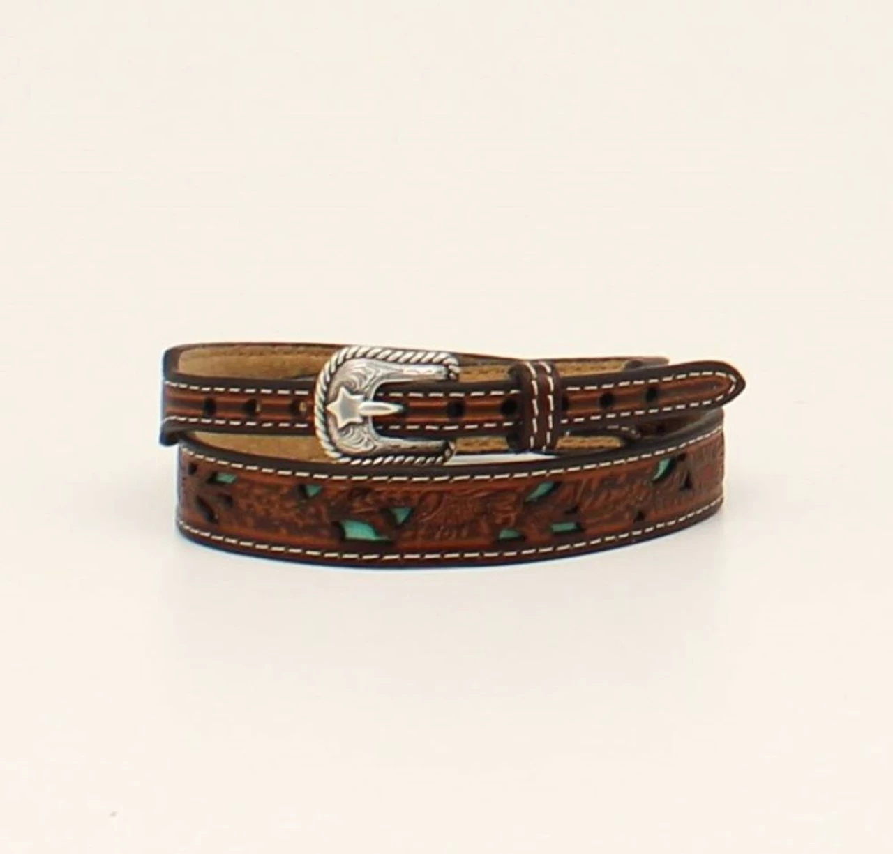 Twister genuine leather tooled hatband with turquoise underlay from M&F Western Products. The band is 3/4″ wide and tapers down to 3/8″ and features a siver tone buckle closure.